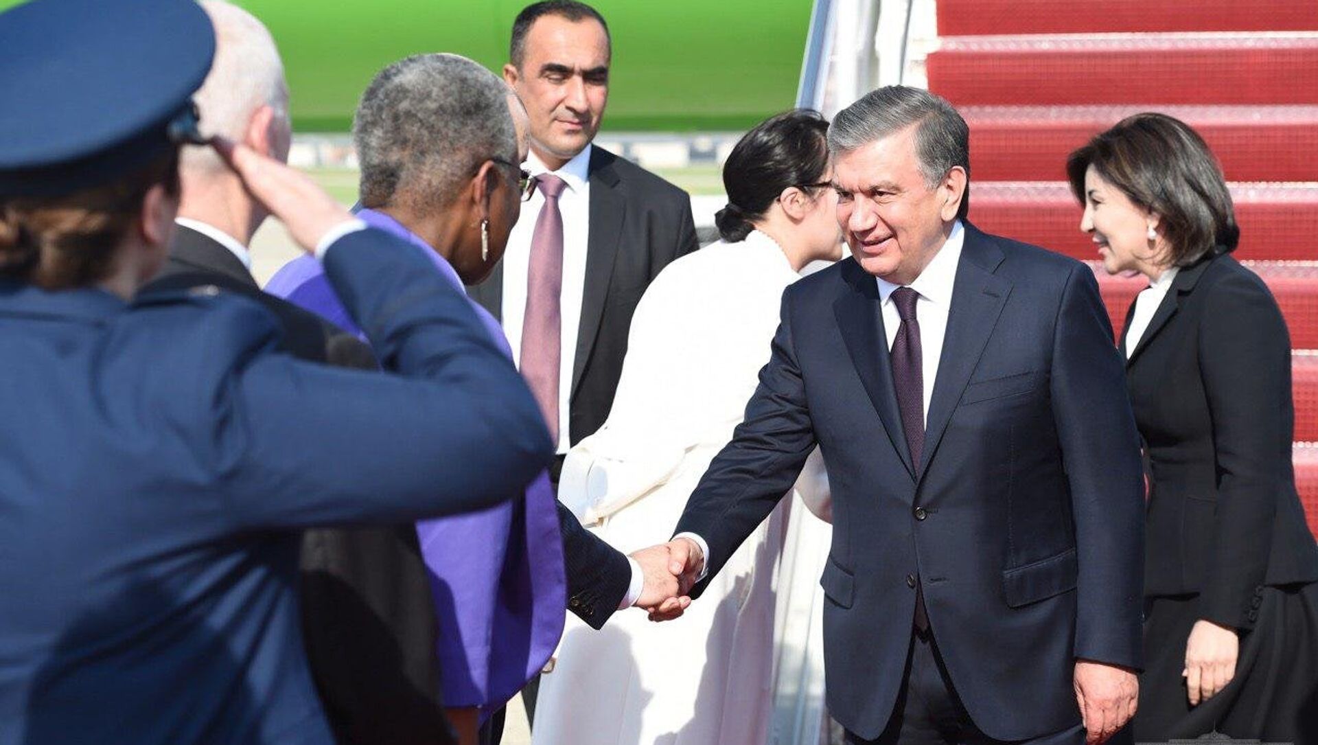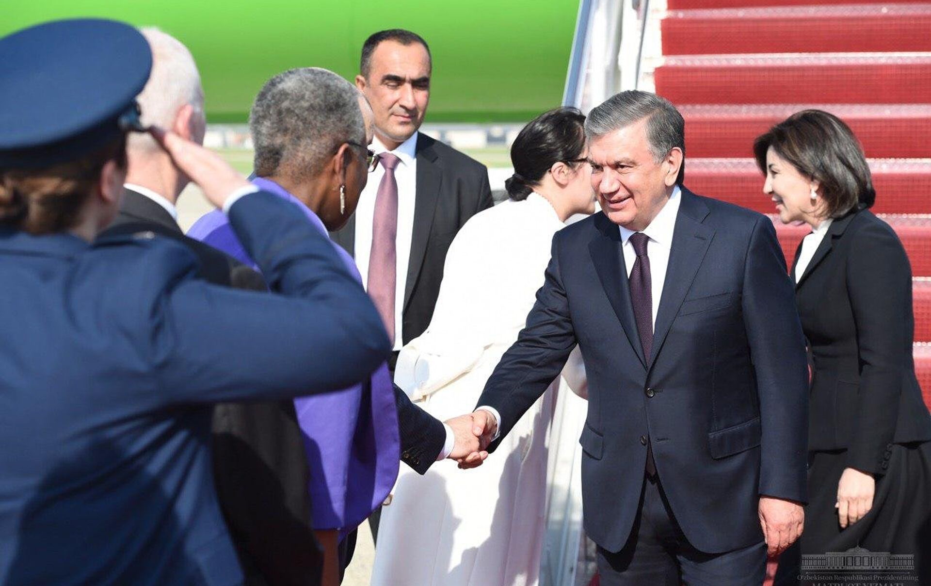 В аэропорту Эндрюс в Вашингтоне Мирзиёева с супругой Зироатхон встретили члены правительства США.