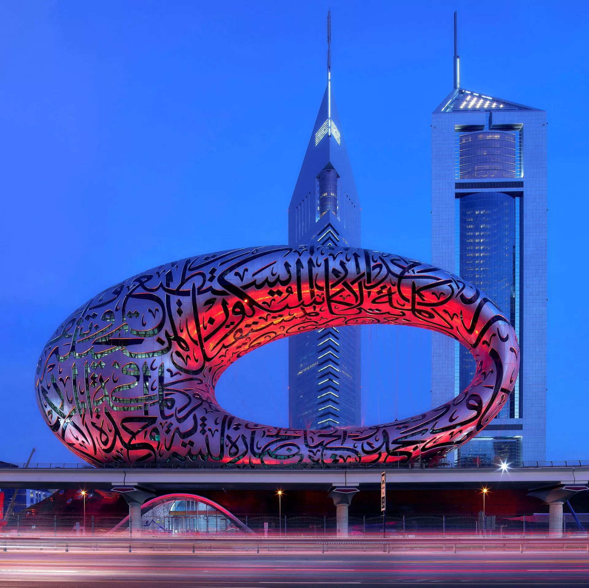 Фасад покрыт арабской каллиграфией: цитатами правителя Дубая шейха Мухаммеда.