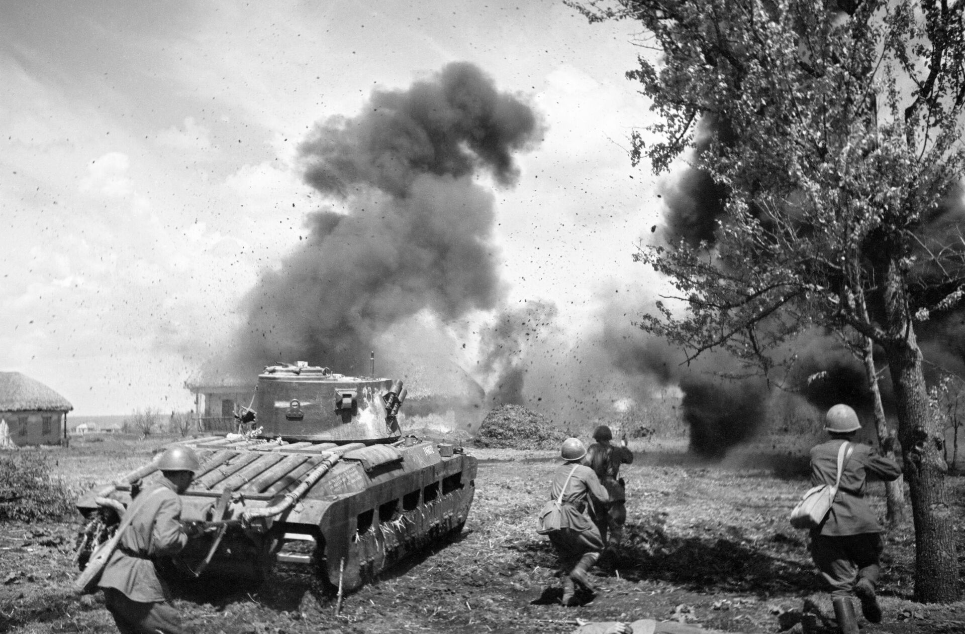 Донбасская стратегическая наступательная операция войск Юго-Западного фронта. Красноармейцы под прикрытием танка "Матильда" идут в атаку в районе города Змиев
