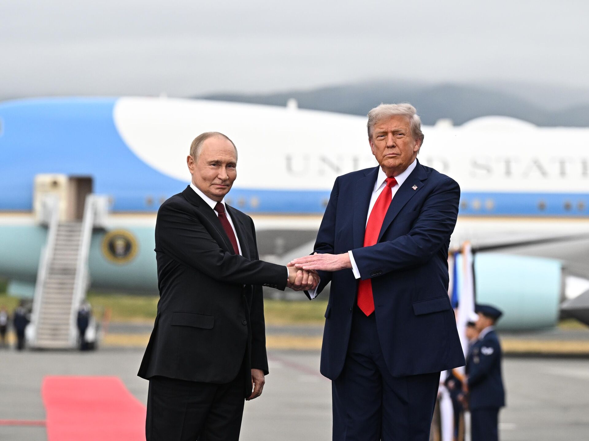 Владимир Путин и Дональд Трамп пожимают руки во время встречи на военной базе Эльмендорф-Ричардсон на Аляске.