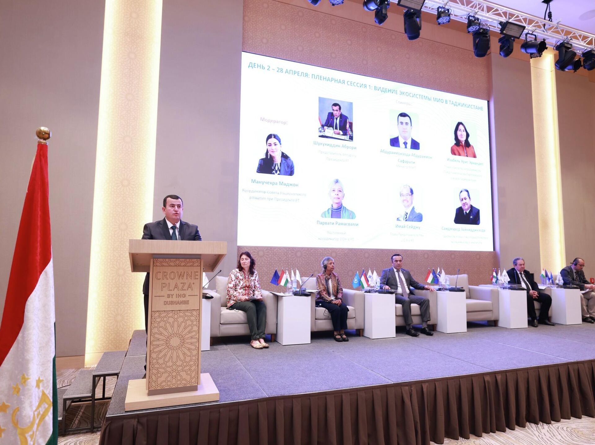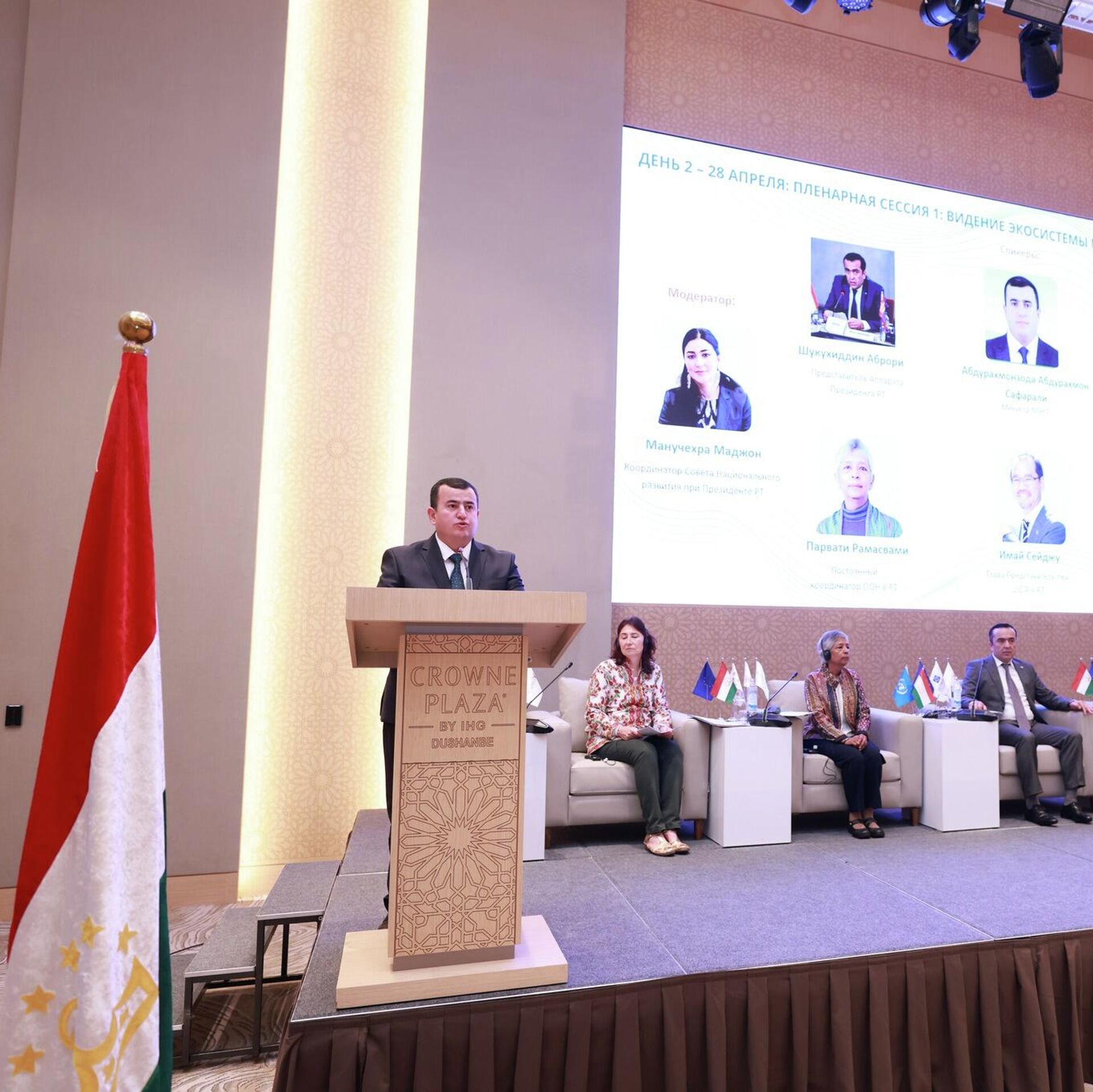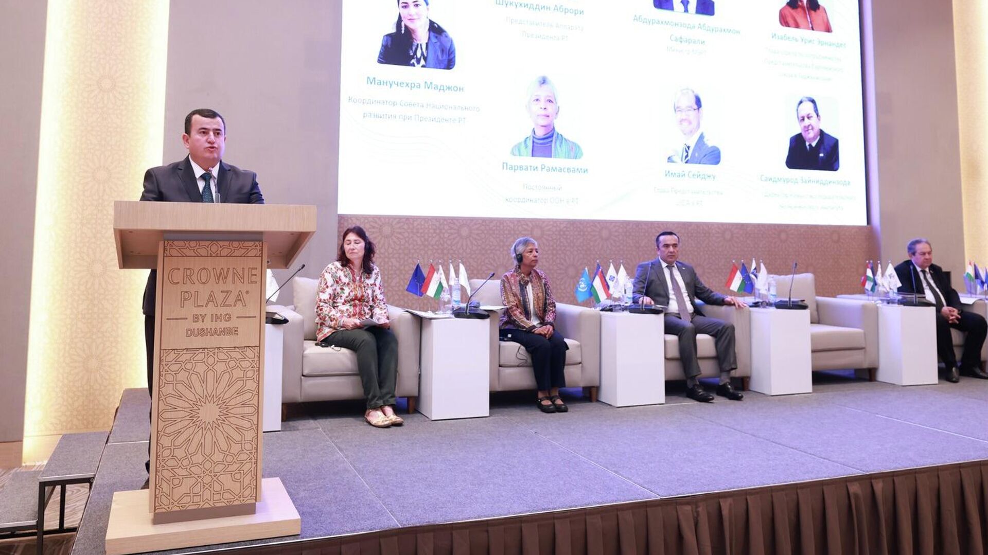 Помимо него на мероприятии присутствовали несколько ответственных лиц, среди которых помощник президента Таджикистана по экономическим вопросам Шукухиддин Аброри и постоянный координатор ООН в республике и сопредседатель Совета по координации развития Парвати Рамасвами.